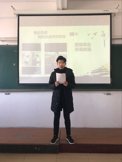 铭记,不只是民族的悲怆,还有落后必亡的训诫。纪念,从不为宣扬复仇的怨念,只为许下复兴的心愿:吾辈当自强。这一刻,不时从教室中传来同学们激情澎湃的声音,这是建筑工程系的同学们在2A407学习陶传蔚副院长在前不久为纪念南京大屠杀死难同胞原创的一首爱国诗。12月26日,建筑工程系副主任董青、团总支书记王海涛、辅导员及学生会干部以及各班级团支书参加了本次活动。