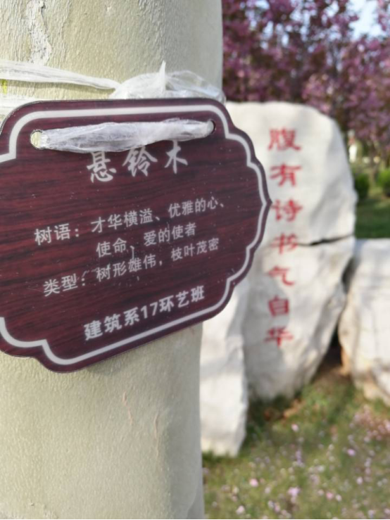 据悉,这次活动是在17环艺班班主任刘悦滋老师带领下举办的,是将专业学习运用到实践中去的“第二课堂”。在前期准备工作中,学生们以小组为单位去收集各类植物的习性、品种、寓意等相关资料,为每一种植物都设计了极具特色的介绍内容并进行了各种“同心牌”的制作。5月1日下午,学生们针对图书馆及中心大道花园林间的悬铃木、美人梅、龙爪槐、紫叶李等植被简介进行了“同心牌”宣挂活动,而像连翘,榆叶梅,玉兰等这种极具观赏性的植物,学生们还写上了与之相对应的花语、树语:“玉兰花语:高洁、芬芳、纯洁、忠贞不渝爱情、报恩。性喜光,较耐寒,可露地越冬。爱干燥,忌低湿,栽植地渍水易烂根。”
