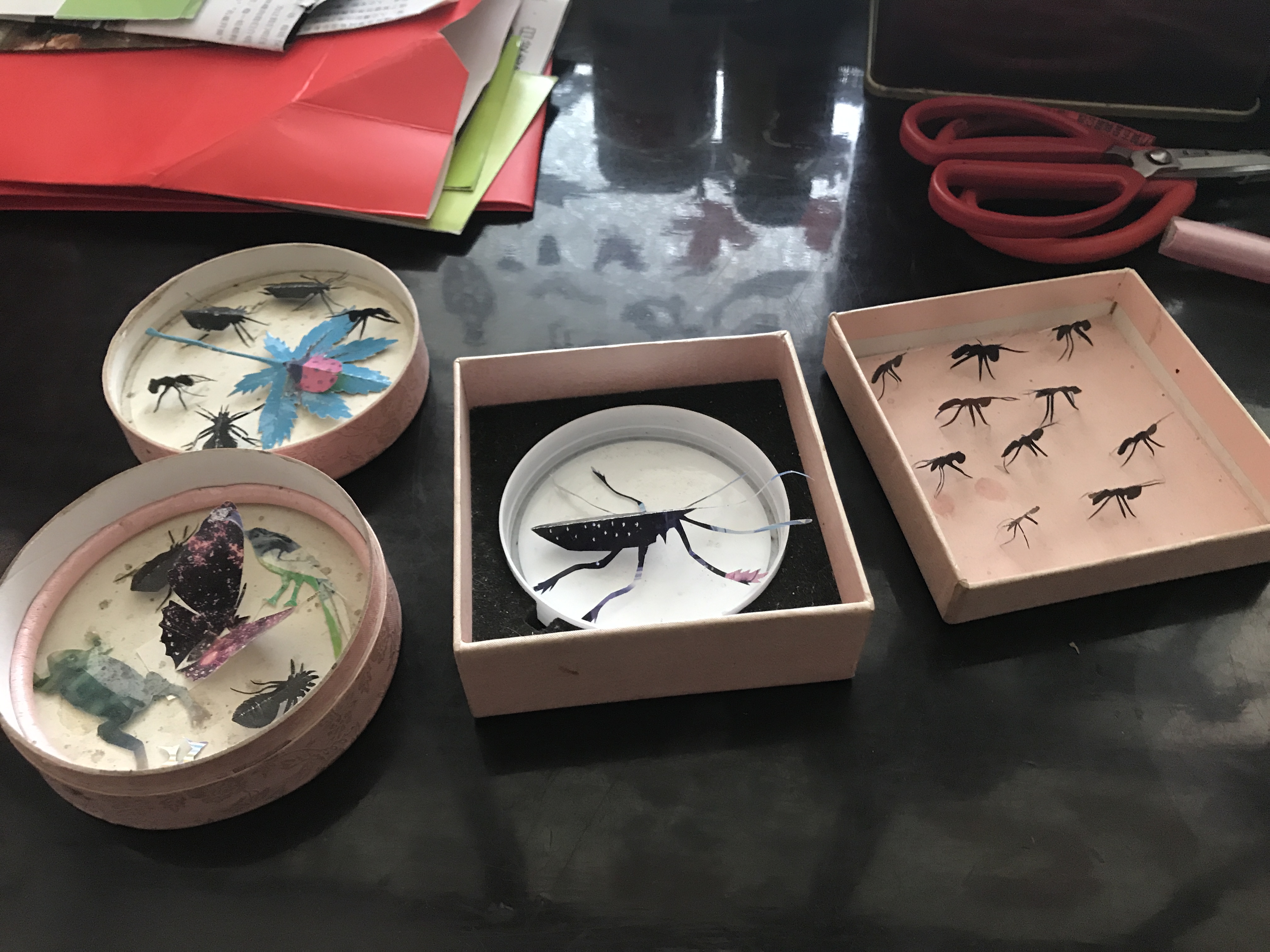 一进门,战大爷就热情地带领我们参观了他近年来的作品,墙上、桌上、纸盒里满满一屋子,小到蚂蚁、昆虫,大到骆驼、仙鹤,全都栩栩如生、活灵活现,仿佛置身于艺术的殿堂。