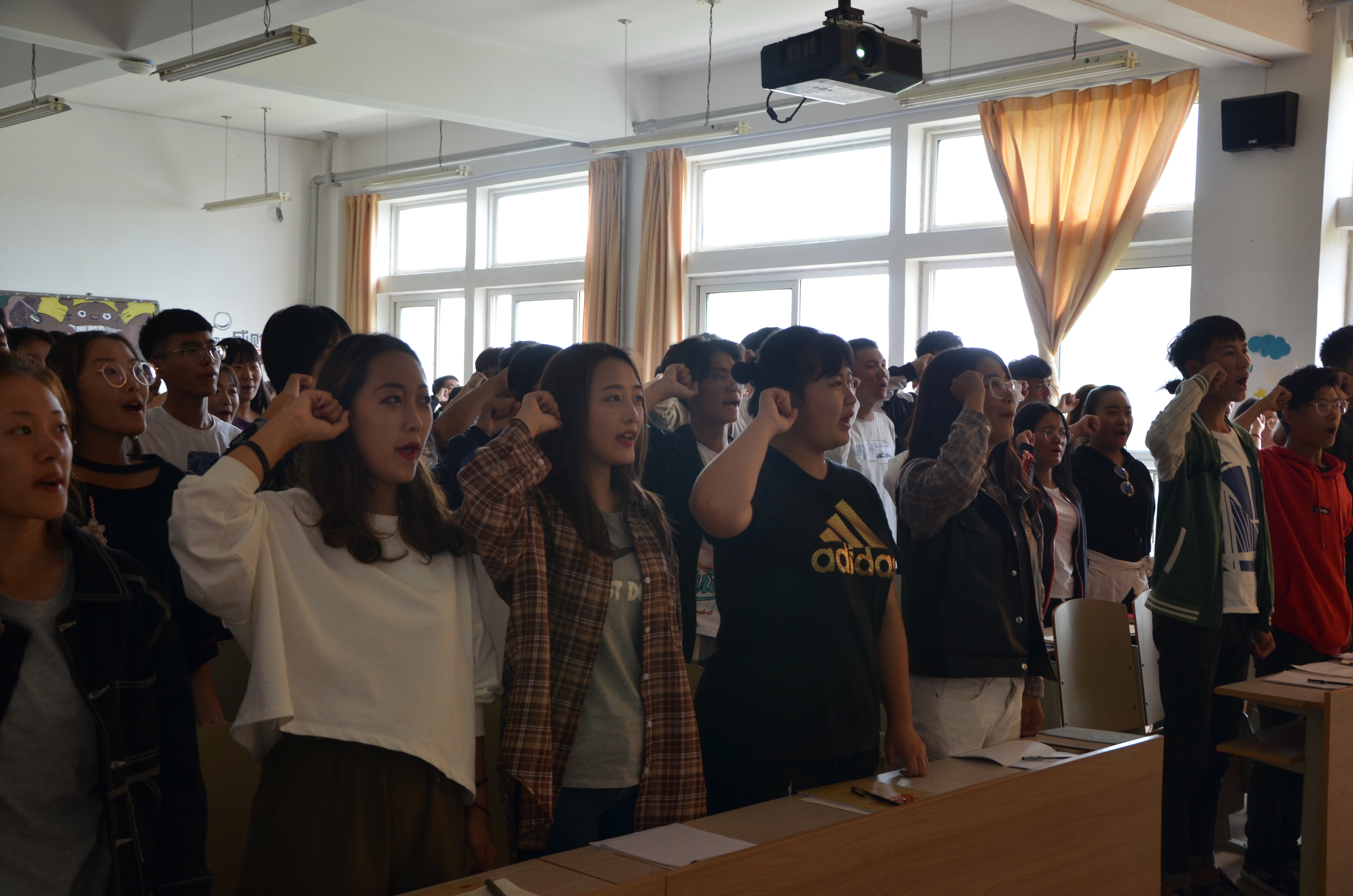 军训期间的热血和激情仍充斥在心中,抗日胜利纪念日的礼炮声还回荡在耳畔,伴随着激昂的国歌声,“吾辈当自强”的主题班会拉开了序幕。同学们以不同的形式,纪念了那段难忘的历史。有的班级展开热烈的谈论,结合当前的国际形式,发表自己对理性爱国的理解;有的班级开展红歌会,用歌声表达对革命前辈的崇敬;有的班级组织开展观看了纪念“九一八”的ppt,在光影的交错中重温历史。