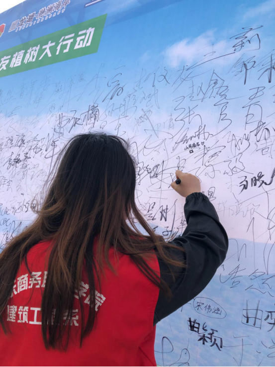 “小红帽”们自备工具,冒着严寒经过近两个小时的车程来到植树基地,简单分组后,便迅速加入造林大军。大家互相配合,有的挥锹铲土、有的扶树填土、有的培土浇水,每个人都忙得不亦乐乎。经过一个多小时的劳动,两排绿树在山地的前坡 “安家落户”,为那里添上了一片新绿,“小红帽”们看着自己亲手种植的一株株小树苗在微风中摇曳,无不露出幸福的笑容。17装饰1班的池鑫林为自己的“劳动成果”命名“希望”,并在心愿墙上留下了自己的印迹。