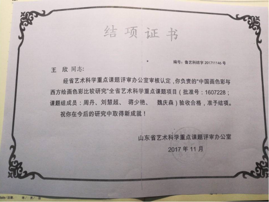 由建筑系教师王欣主持,刘慧超等其他四位老师参与的山东省艺术科学重点课题项目——《中国画色彩与西方绘画色彩比较研究》,经过一年多的研究,与近日正式结题。