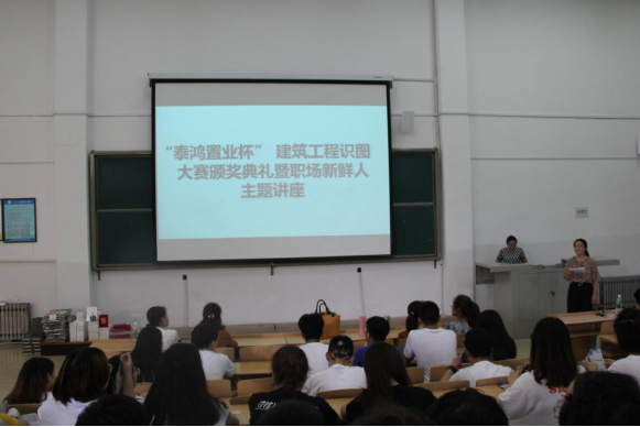6月29日下午,建筑工程系“泰鸿置业杯”建筑工程识图大赛颁奖典礼在二号楼第二阶梯教室举行。建设工程管理专业、工程造价专业的部分教师以及17级、18级各班主任老师、大赛指导老师、山东泰鸿置业有限公司技术部主任杨小苑、山东泰鸿置业有限公司人力资源部经理杨思思莅临本次颁奖典礼。