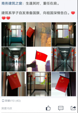 生逢其时,重任在肩。9月28日,建筑系学子自发准备国旗,在宿舍门口外悬挂着一面国旗,争做国旗护旗手。据了解,建筑系现住约宿舍350个,在校生1800人左右,同学们走进建筑系学生宿舍,纷纷表示感受到浓厚的国庆气息。
