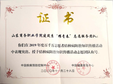 | 2019年度百千万志愿者结核病防治知识传播活动中,荣获“结核病防治知识传播活动优秀志愿团队”称号