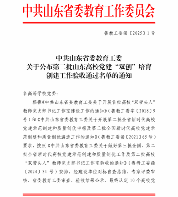 近日,山东省委教育工委正式发文(鲁教工委函〔2025〕1号),我校建筑工程学院学生党支部以优异成绩通过第二批全省高校党建"双创"样板支部验收。该成果的取得,彰显了学校全面加强基层党建工作的鲜明导向和显著成效,标志着学校在构建"一融双高"党建工作格局中迈出了关键一步。