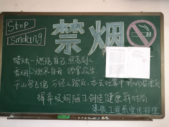 为响应学校建设“无烟校园”的号召,维护正常的教育教学秩序,保障学生的生命财产安全,推进师生共建平安校园,建筑工程系对2A教学楼、学生宿舍和图书楼教学办公区组织开展一系列“禁止吸烟”专项整治活动。