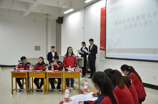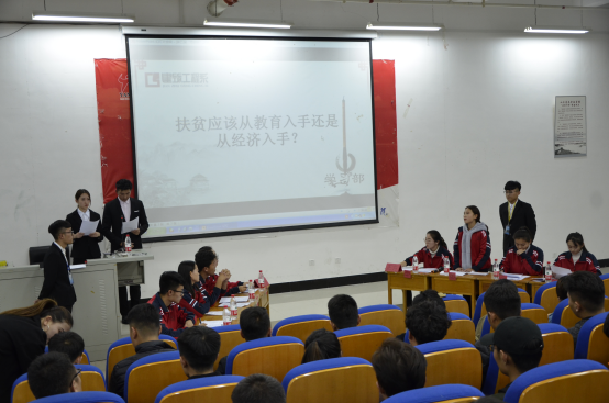 在赛前宣传阶段,同学们就展现出了极大的热情,初赛阶段共有40支队伍报名参赛,经过层层交锋,最终刘敏、刘书雨等八名同学带领两只队伍闯入决赛,围绕“扶贫应该从教育入手还是经济入手”的辩题展开了激烈的辩论。在比赛过程中,八位辩手旁征博引、妙语连珠,理论联系实际从不同角度论证了教育和经济对扶贫的重要作用。双方辩手针锋相对互不相让,几度使气氛达到白热化,他们清晰的思路和巧妙的陈词,为大家奉献了一场印象深刻的精彩辩论。