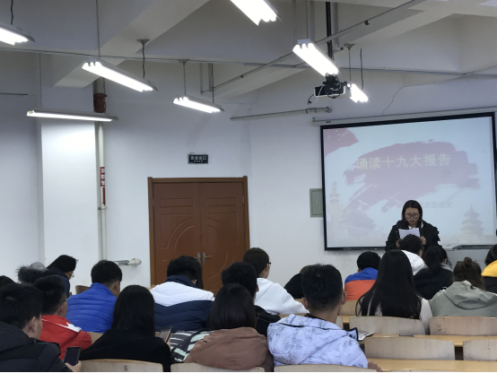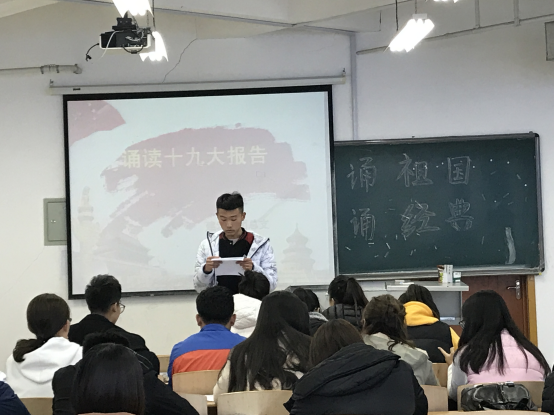 在本次活动中,分为原文朗读、要点提问、体会交流三个环节。主要围绕十九大报告部分章节展开,同学们先后进行了字正腔圆、声情并茂、铿锵有力的诵读,赢得了大家阵阵掌声。17造价三班的徐龙昂和李晓菡共同选择分享选段“青年兴则国家兴,青年强则国家强。青年一代有理想、有本领、有担当,国家就有前途,民族就有希望”,表达了身为当代大学生青年要坚定理想信念,志存高远,脚踏实地,勇做时代的弄潮儿的决心。17装饰三班的崔国强则朗诵了“中华民族是历经磨难、不屈不挠的伟大民族,中国人民是勤劳勇敢、自强不息的伟大人民,中国共产党是敢于斗争、敢于胜利的伟大政党。”选段,抒发了对“国家许我以信心,我许国家以未来”的情感。活动中,主持人结合所诵读的内容,现场抽点人员回答应知应会要点,请大家畅谈体会心得。大家纷纷结合中心实际、成长经历和自身理解,谈收获、话感悟,现场气氛热烈、互动活跃。“生生不息的中国犹如涅槃的凤凰,在烈焰中获得了重生,在伟大的中国共产党的领导下,一跃成为一个充满希望、充满活力、充满激情的青春中国。”有同学动情的说。