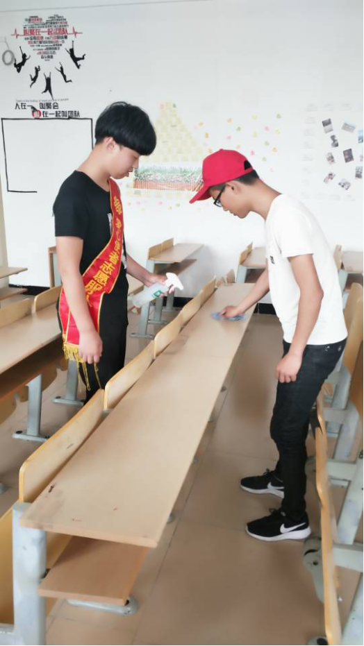 “一清”:全面清理教室卫生。“小红帽们”以组为单位,以教室为划分,分工合作:“海绵宝宝”组将扫帚、拖把齐搬上阵,桌底、地面打扫的一尘不染;“擦擦擦”组则将桌椅、台面擦洗干净,两个小组你追我赶,一个崭新的教室随即映入眼帘。“二消”:“一清”之后,“小红帽们”在在巩斌老师的带领下,将提前准备好的84消毒液按配液比例兑好,严格遵守消毒注意事项的情况下,对每个教室进行了彻底消毒。