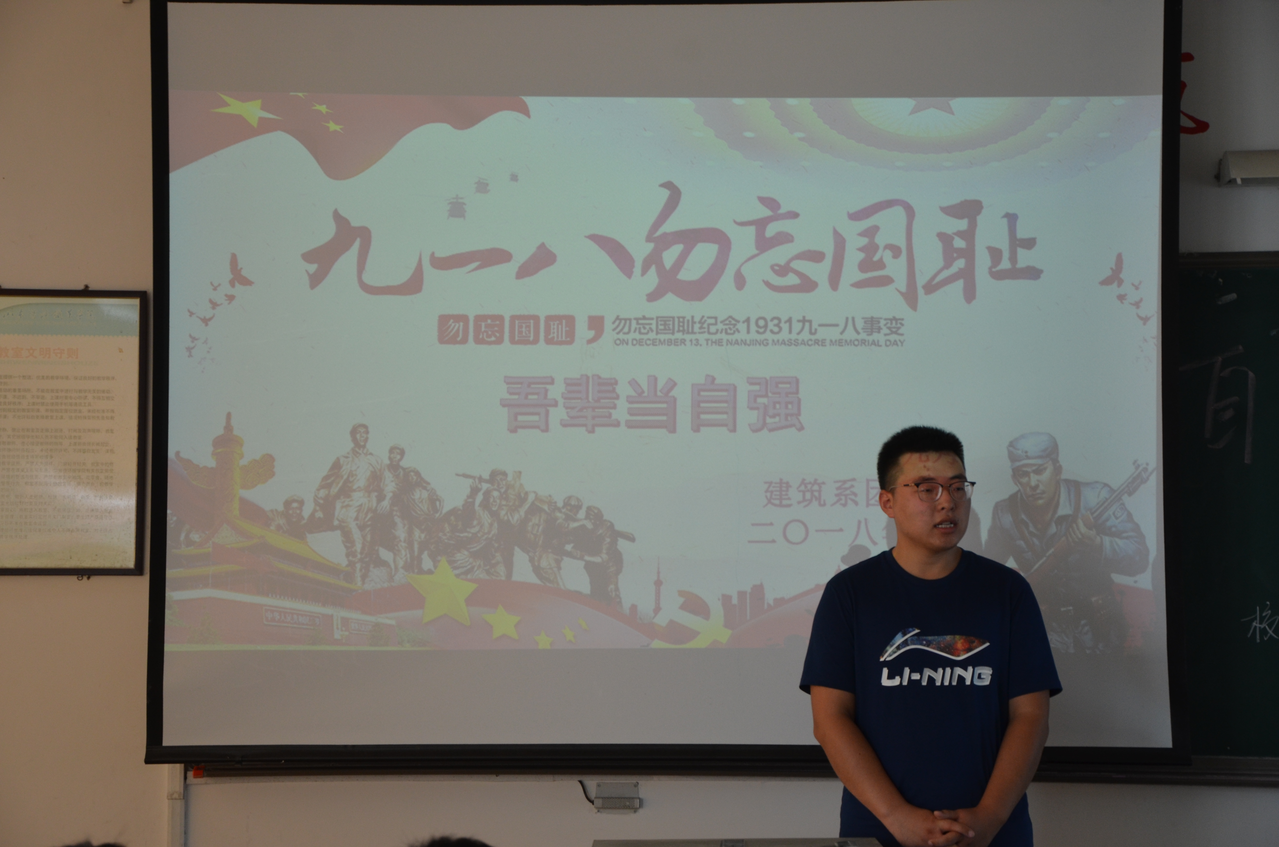 以史为镜,可以知兴亡;以古为镜,可以知兴替。通过开展“勿忘九一八,吾辈当自强”主题班会活动,建筑系学生对中华民族从沉沦到奋起,从苦难到辉煌的发展过程的有了深刻认知。缅怀先烈,警钟长鸣,勿忘国耻,吾辈自强。(刘松琳)