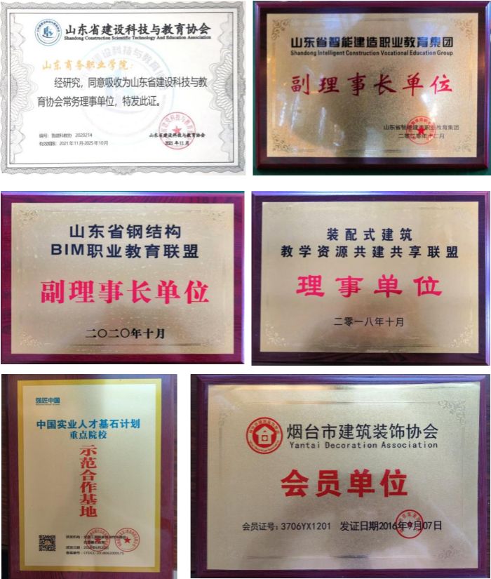 建筑工程学院为山东省建设科技教育协会常务理事单位;山东省智能建造职业教育集团、山东省钢结构BIM职业教育联盟副理事长单位;装配式建筑教学资源共建共享联盟理事单位;烟台市建筑装饰协会、室内设计师协会会员单位;“强匠中国”中国实业人才基石计划重点院校示范合作基地;山东省职业技能等级认定社会培训评价组织。建筑工程学院在省内高职院校具有较高知名度和影响力,人才培养质量深受好评。2023年,学院牵头成立烟台市装配式钢结构产教融合共同体,统筹发挥联合体内政府机构、院校、科研院所、企业各行政单位的积极性,推进资源共享、共建,提升人才培养质量,提高服务区域发展的能力。